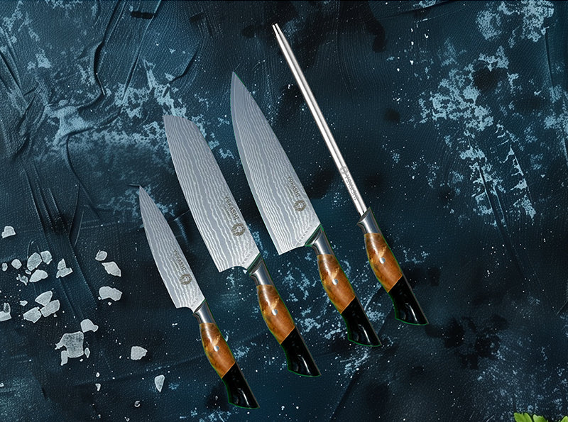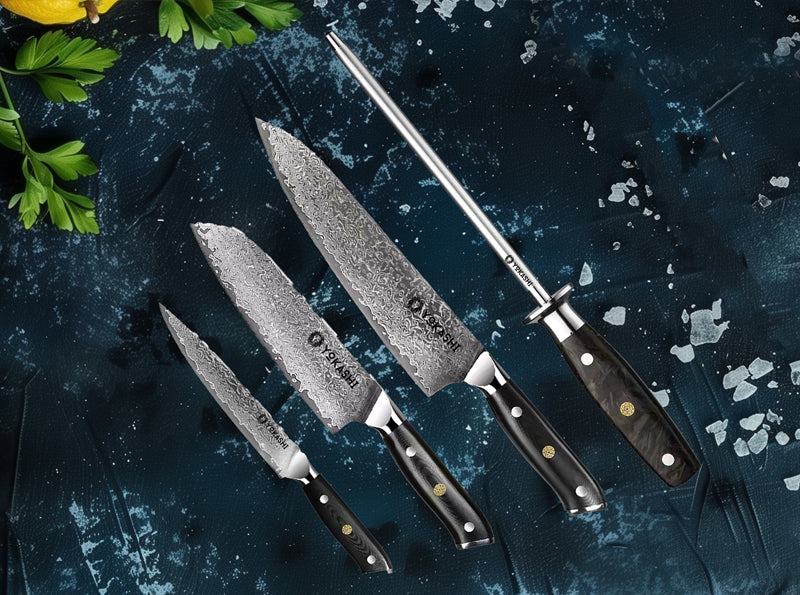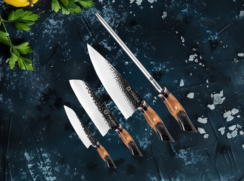 A foundational set of expertly crafted knives including a Chef’s Knife, Paring Knife, Utility Knife, and Honing